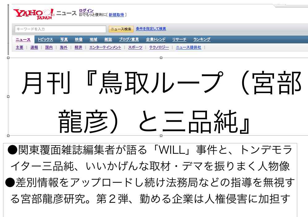 世界の常識や流れを無視する、いや、意図的に逆行しているのは少数者の言動ですが、目立つから有頂天になっているのかなと思えます。でも、少数派であることのいらだちが、許し難い過激なネット上での言動となっているのかもしれません。多くの人々がまだ、心の奥に内包している悲しき差別意識をあおる事、その意外な反応に孤立した彼等が喜んでいるのかもしれませんね。でも、それもまた少数者の変な思想的傾向を持つ人々ではないかと思えます。「鳥取ループ」こと宮部龍彦氏と三品純(仮名らしい)氏の行為は、それらの人々に比して、圧倒的大多数の人々の怒りや批判の的となっている事、これははっきりしています。彼等ほど極端な差別主義者、差別煽動する人物は希有であるといえます。それは、彼等の理屈や言い分の質が高いか低いかという事と無関係です。あまりに、、、レベルの低い二人の主張だ、、、、その一言です。「相手にする値打ちもない」という人々が圧倒的多数だと言えます。しかしながら、レベルと質の低さに無関係に、多くの人々に影響を与える可能性があるという事は、公汎に流れるネットを舞台とした表現や活動スタイルから来るものだと言えます。くだらない彼等の主張は黙殺してきた人も多いわけです。しかし、人権団体や法務局が、「鳥取ループ」(宮部龍彦氏)や三品純 氏の動きを批判し始めているのは、そこに起因すると思えます。それを、あたかも自身の活動内容の影響力と喜ぶ両名は失笑を買いますね。以下のように両者に対する多くの批判HPが存在します。